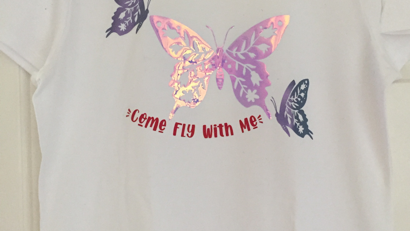 Continue readingAnother Plain T Shirt decorated with Butterflies, again not just one!! These Butterflies are made out of Holographic iron on